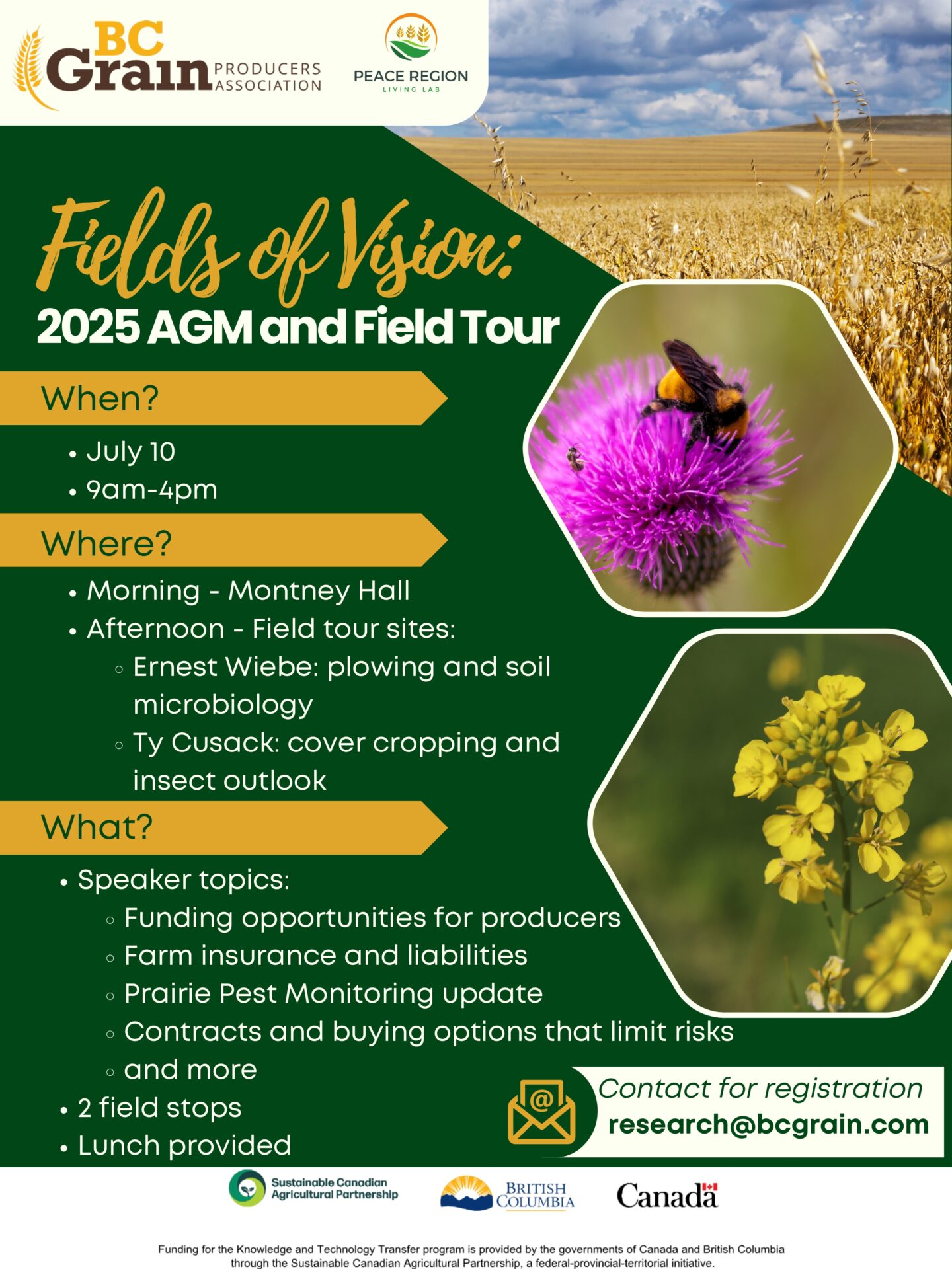 Hello BC Grain members, this is a reminder our AGM and field tour is rapidly approaching this Thursday (July 10th). The event will include interesting topics such as soil microbiology integration, large farm equipment transportation regulations, insurance information, funding opportunities, as well as a field tour of two of our Peace Region Living Lab sites. The event is FREE with a FREE lunch! To RSVP email research@bcgrain.com